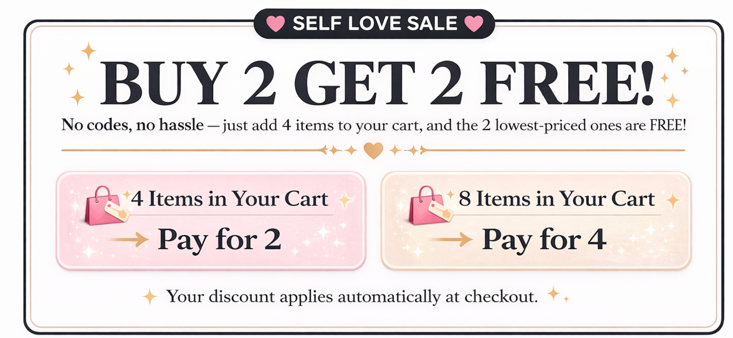 Add 4 pieces of jewelry to your cart, and the least expensive 2 items will automatically become FREE at checkout—no coupon code needed!